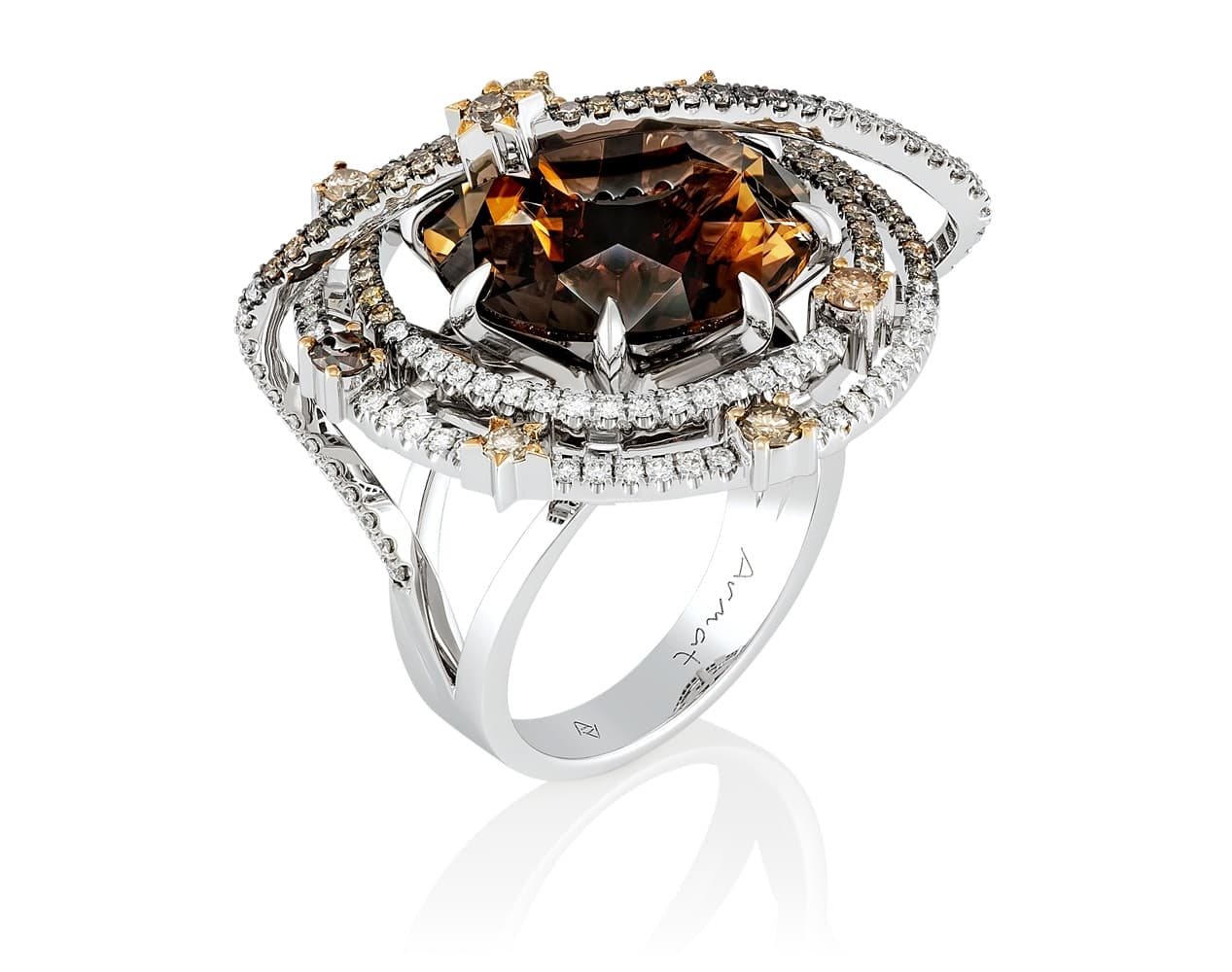 Огромное количество бриллиантов, рассыпанных по ободку и шинке, — не просто сияют, они создают ощущение движения света. Здесь и редкие бриллианты цвета коньяка, подчёркивающие тепло топаза, и безупречно белые, усиливающие контраст и чистоту формы.