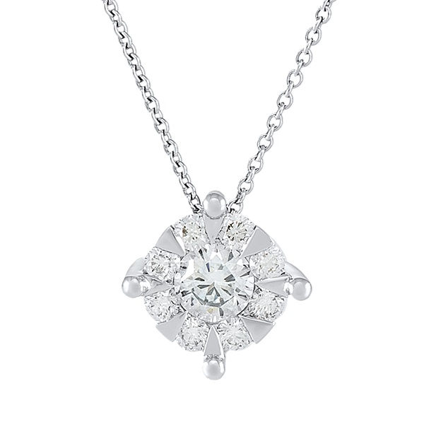 Словно капля света на коже, этот кулон собирает восхищённые взгляды в одном едином сиянии. Один выразительный центральный бриллиант заключён в сияющий ореол из восьми маленьких, создавая эффект живого света, будто солнечный луч, пойманный в движении.