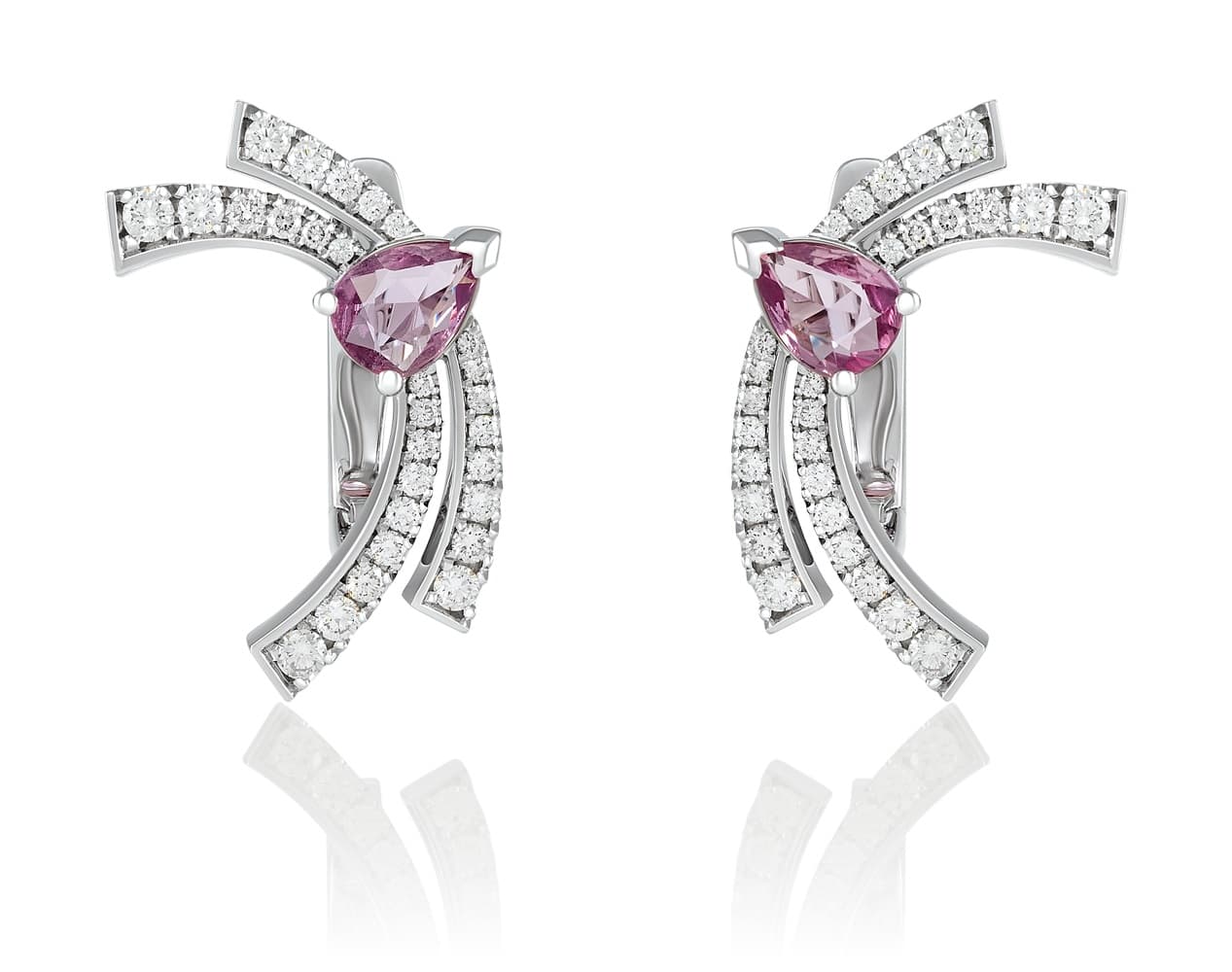 В центре — редкий розовый сапфир грушевидной огранки. Его оттенок — глубокий, с едва уловимой сиреневой нотой. Он словно застывшая эмоция: яркая, но внутренняя.