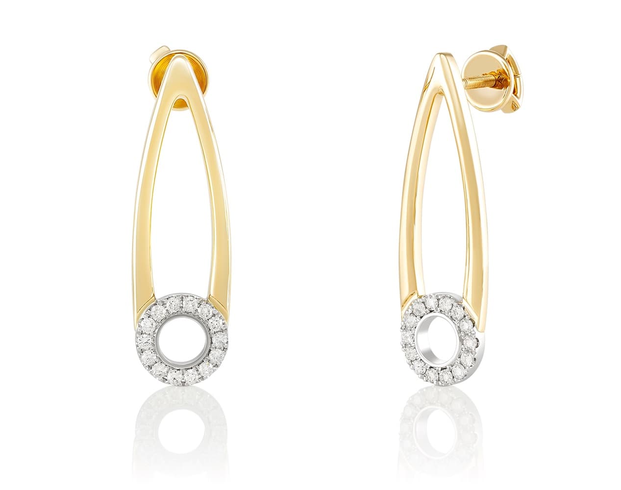 Эти серьги — словно графика, нарисованная светом. Линия чистая, выверенная, без изгибов и флирта. Внизу — кольцо, усыпанное бриллиантами. Оно не кричит — оно собирает свет в точку, в завершение, как уверенная точка в конце фразы.