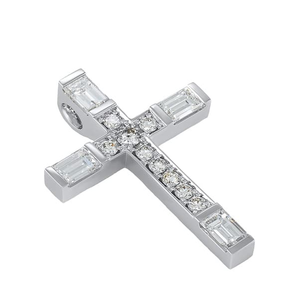 Четыре бриллианта багетной огранки создают эффект глубины и гармонии, подчёркнутый центральным круглым бриллиантом и россыпью мелких камней. Вся композиция будто говорит: «Я — твоя вера. Я — твой выбор».