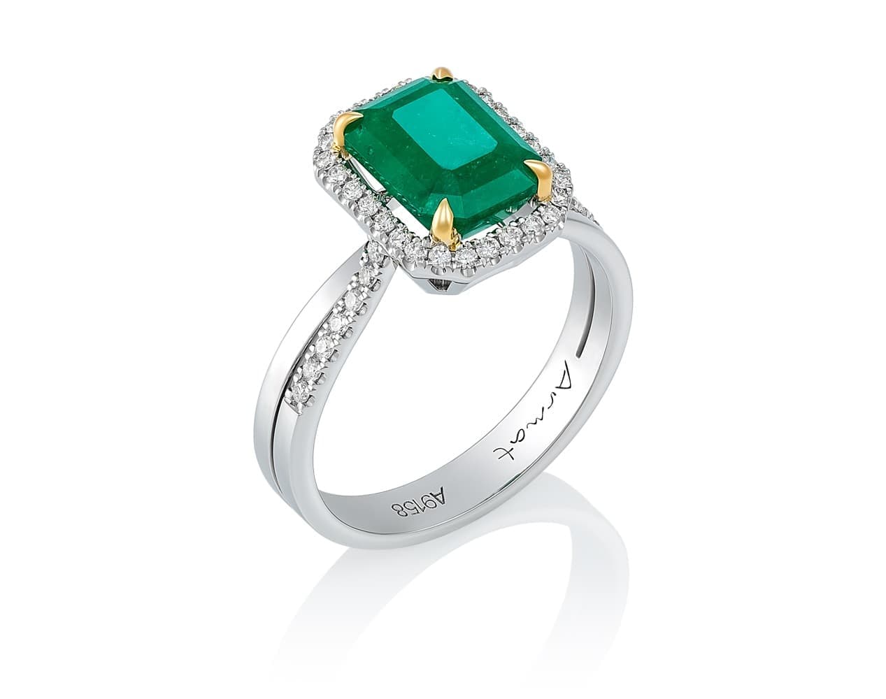 Главный акцент этого кольца — натуральный изумруд, огранённый в форме изящного кушона. Его яркий, живой зелёный цвет словно заключает в себе дыхание весны и вечное обновление жизни. Изумруд происходит из легендарных колумбийских месторождений, где рождались камни для королев.