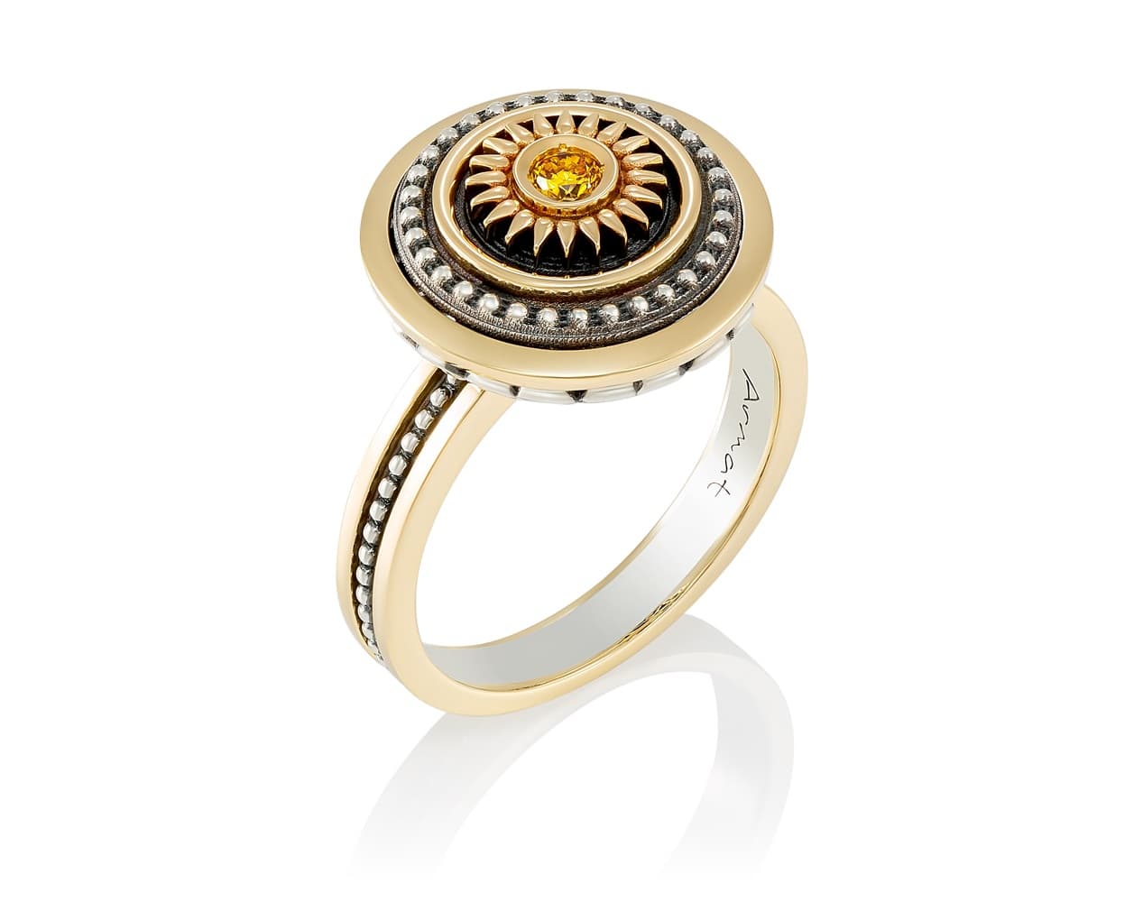 В центре композиции — фантазийный жёлтый бриллиант, сияющий словно солнечный диск. Вокруг — 16 лучей, точно выверенных, как древний знак силы. Каждый элемент — не просто украшение, а знак преемственности, наследия и внутреннего света.