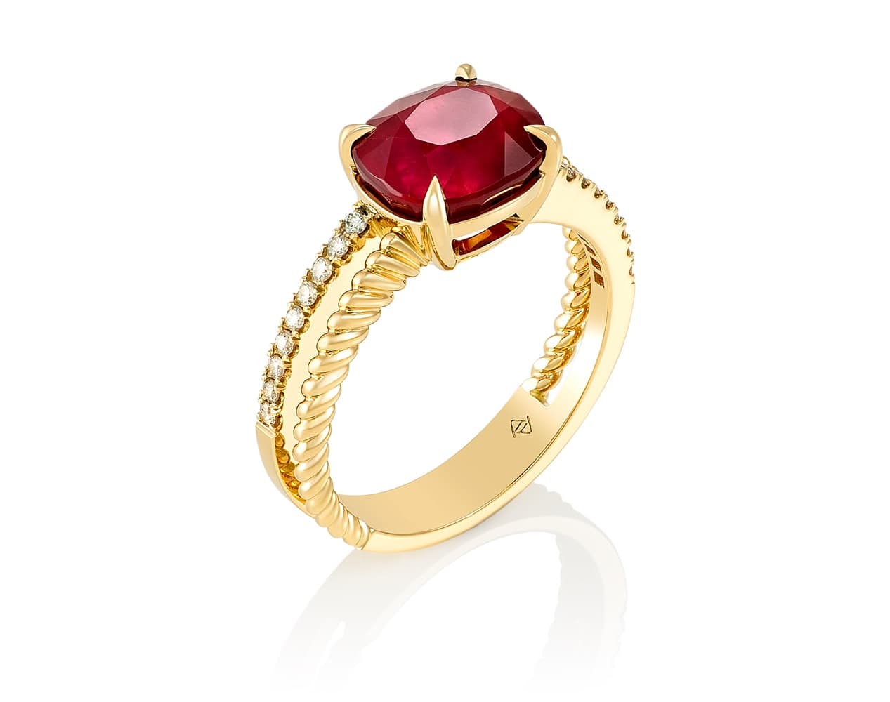 Как будто сердце, застывшее в мгновении страсти — крупный рубин в центре этого кольца пылает благородным, глубоким огнём. Его обрамляет тёплое золото, будто созданное для того, чтобы подчеркнуть его силу и чувственность.