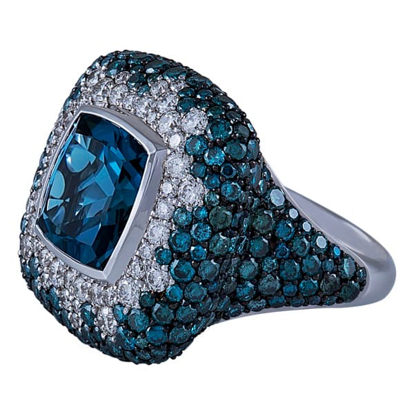 Это кольцо не просто привлекает взгляд — оно пленяет. Лондонский топаз в центре словно затянутое ночное небо — глубокий, насыщенный, чарующий. Вокруг него — сияющая аура из сотен бриллиантов: холодные белые, как лунный свет, и насыщенно-синие, как грозовое небо перед рассветом.