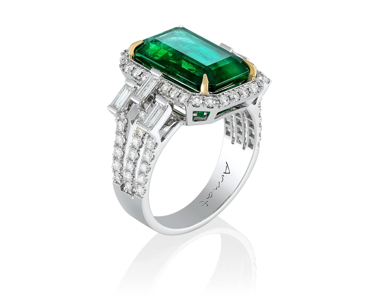 Роскошь кольца подчеркивают три сияющих дорожки из бриллиантов — круглых и багетных, которые создают эффект сияющей архитектуры, обрамляя камень, как трон. Белое золото усиливает чистоту и контраст, подчёркивая каждый из световых акцентов. Это кольцо тяжело не заметить — оно требует присутствия, как искусство требует зрителя.