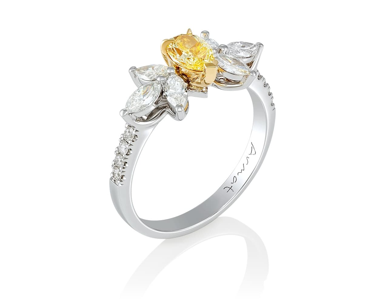 В каждом взгляде на это кольцо чувствуется дыхание света. Жёлтый бриллиант в центре — словно утренняя капля солнца, заключённая в лепестки белых камней. Он не просто сияет — он оживляет всё вокруг. Это кольцо создано, чтобы расцветать на твоей руке каждый день.