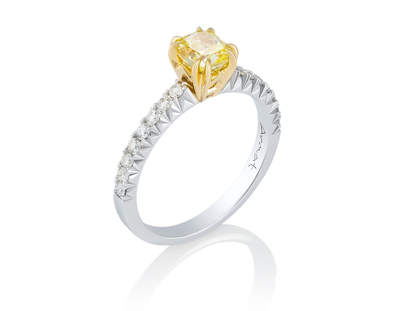 Не каждая женщина нуждается в громких жестах, но некоторые кольца говорят за неё. Центральный фантазийный бриллиант нежного жёлтого оттенка — как отблеск внутренней уверенности, которая не требует доказательств. Его Cushion-огранка делает свет мягким, но глубоким.