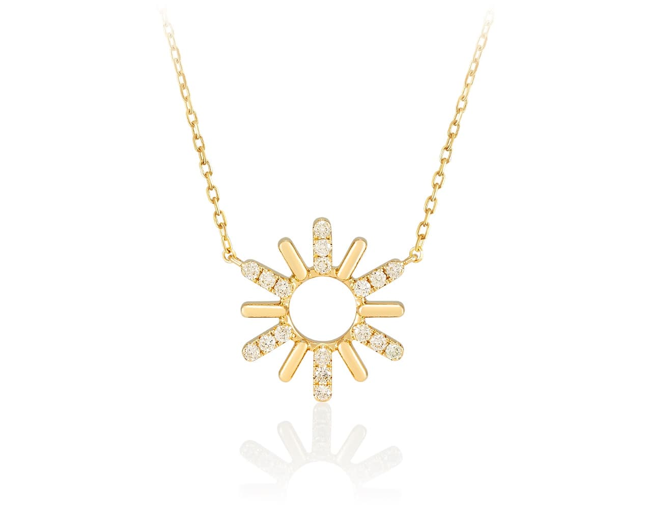 Он словно утренний луч, первый поцелуй солнца, пробуждающий мир своим сиянием. Кулон обнимает тебя мягким золотом и искристым светом бриллиантов, напоминая: ты — источник света, не отражение.