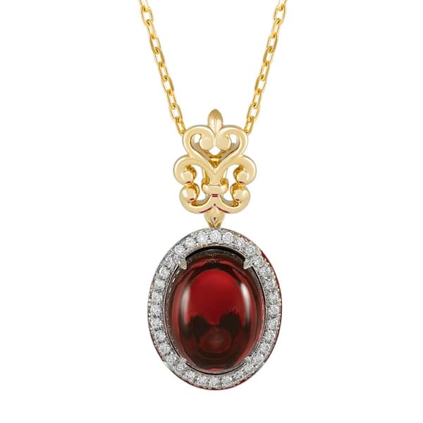Изысканный декор в верхней части кулона напоминает восточные узоры, а обрамление из сверкающих бриллиантов усиливает благородное звучание композиции. Украшение говорит о страсти, характере и тонком вкусе своей обладательницы.