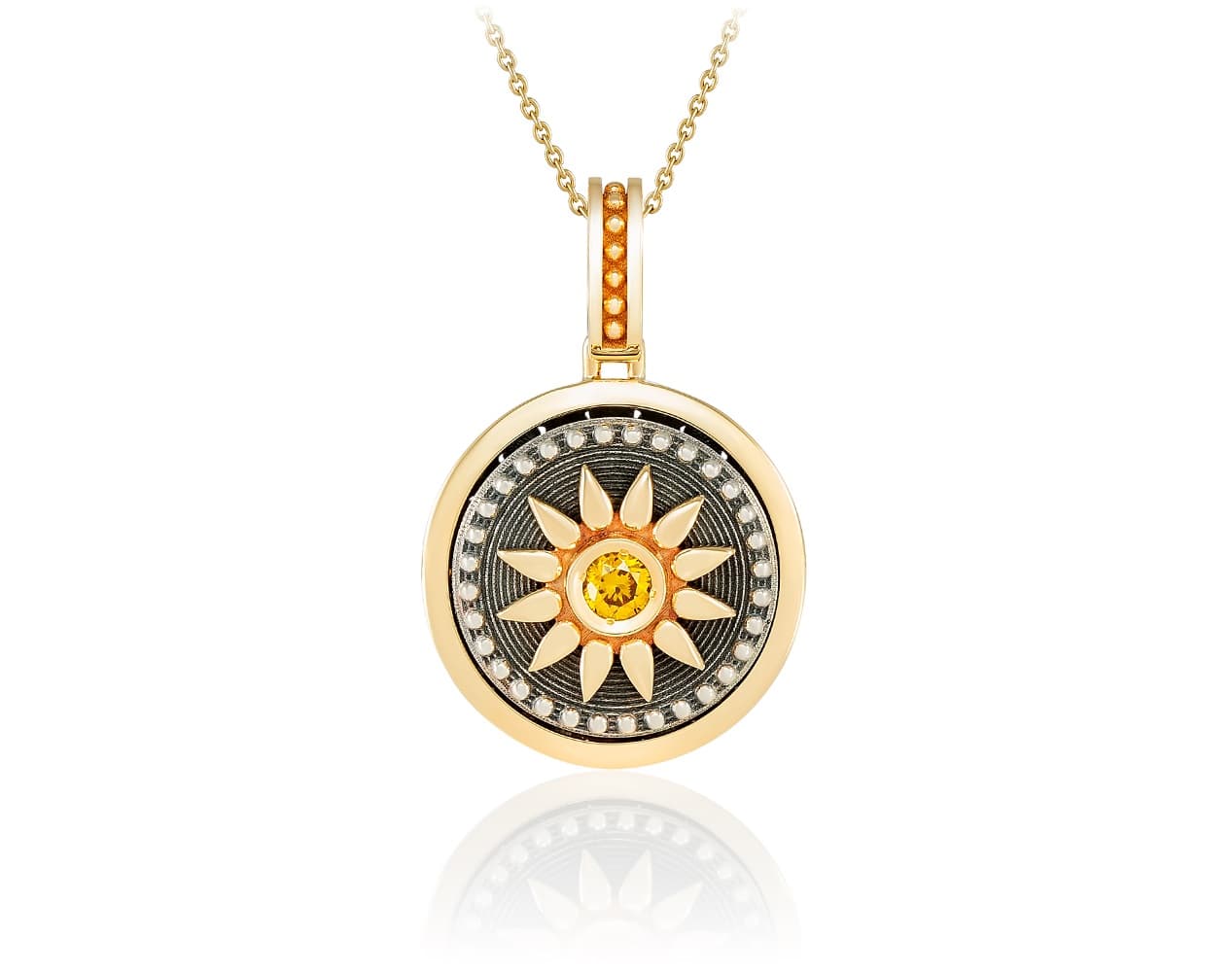 Он как талисман, наполненный светом и теплом. В центре — фантазийный жёлтый бриллиант, пылающий словно капля солнца. Лучи расходятся от него в виде золотых лепестков, будто ты носишь на себе собственное маленькое солнце — источник вдохновения и уверенности.