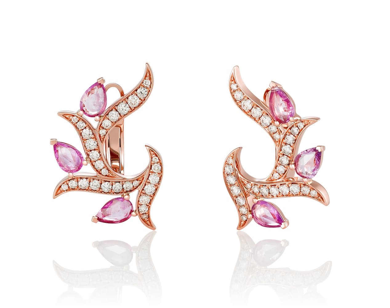 Нежность в каждом изгибе. Эти серьги словно оживлённый флоральный мотив — волны розового золота устремляются вверх, как живые ветви, украшенные сиянием бриллиантов и каплями розовых сапфиров.