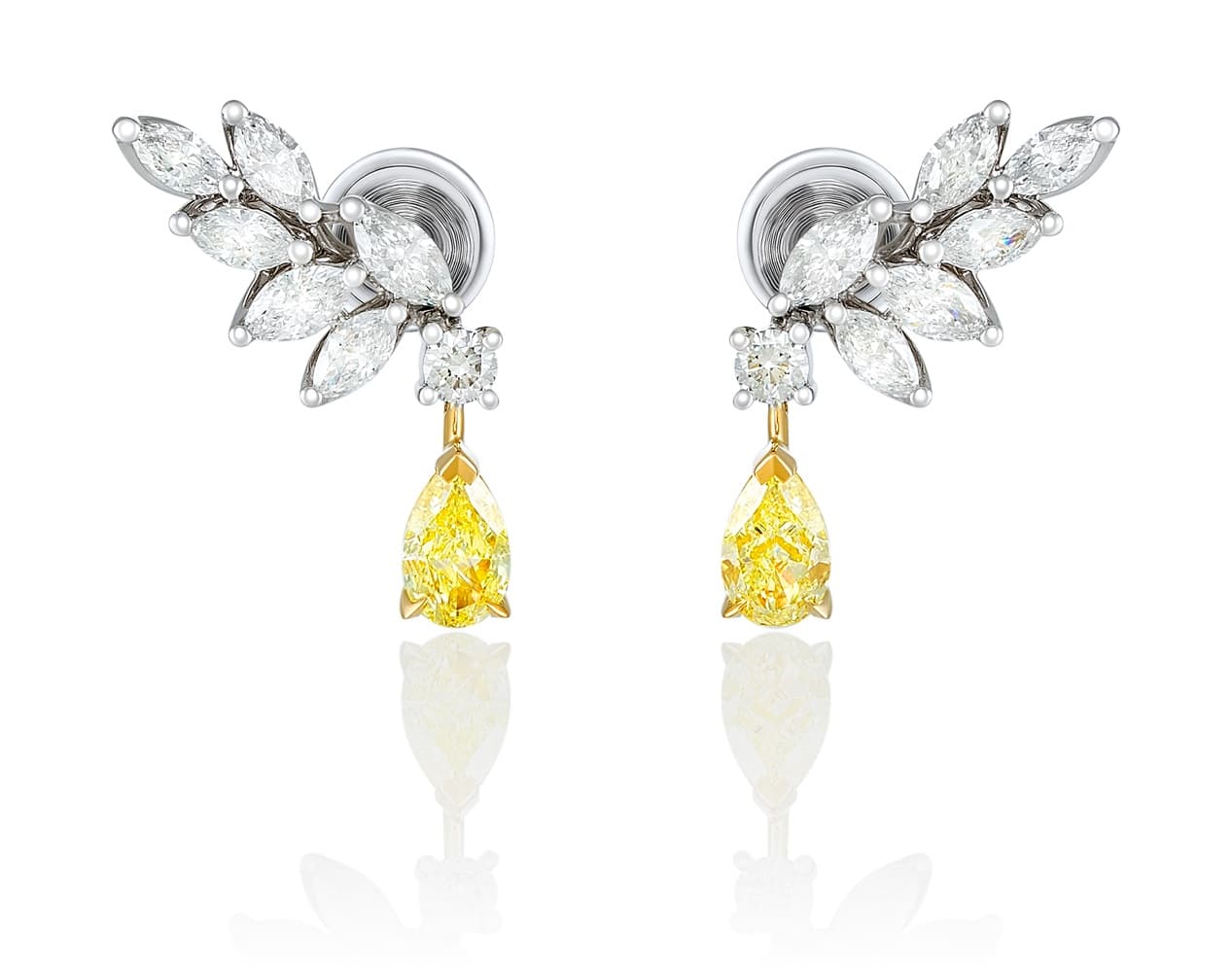 Как утренний луч солнца скользит по капле росы, так и сияние этих серёг приковывает взгляд. Главный акцент — два фантазийных жёлтых бриллианта огранки груша, искрящихся тёплым светом, словно хранят в себе частицу солнечного тепла.
