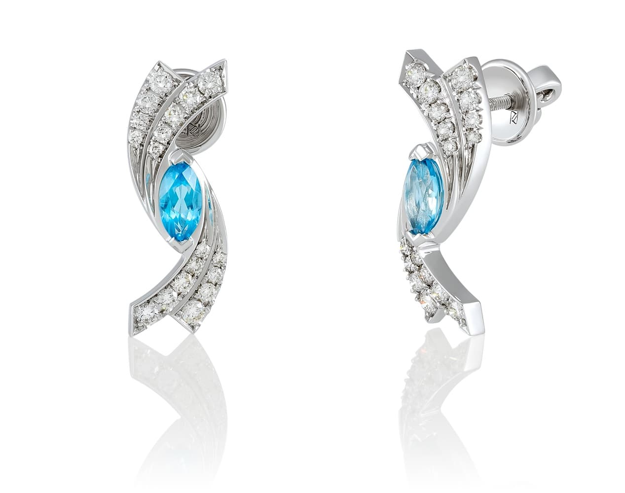 Словно два световых потока, эти серьги обвивают небесно-голубой топаз, притягивая взгляд своей плавной асимметрией. Камни огранки «маркиз» напоминают о чистом небе, лёгком дыхании весны и утренней свежести.