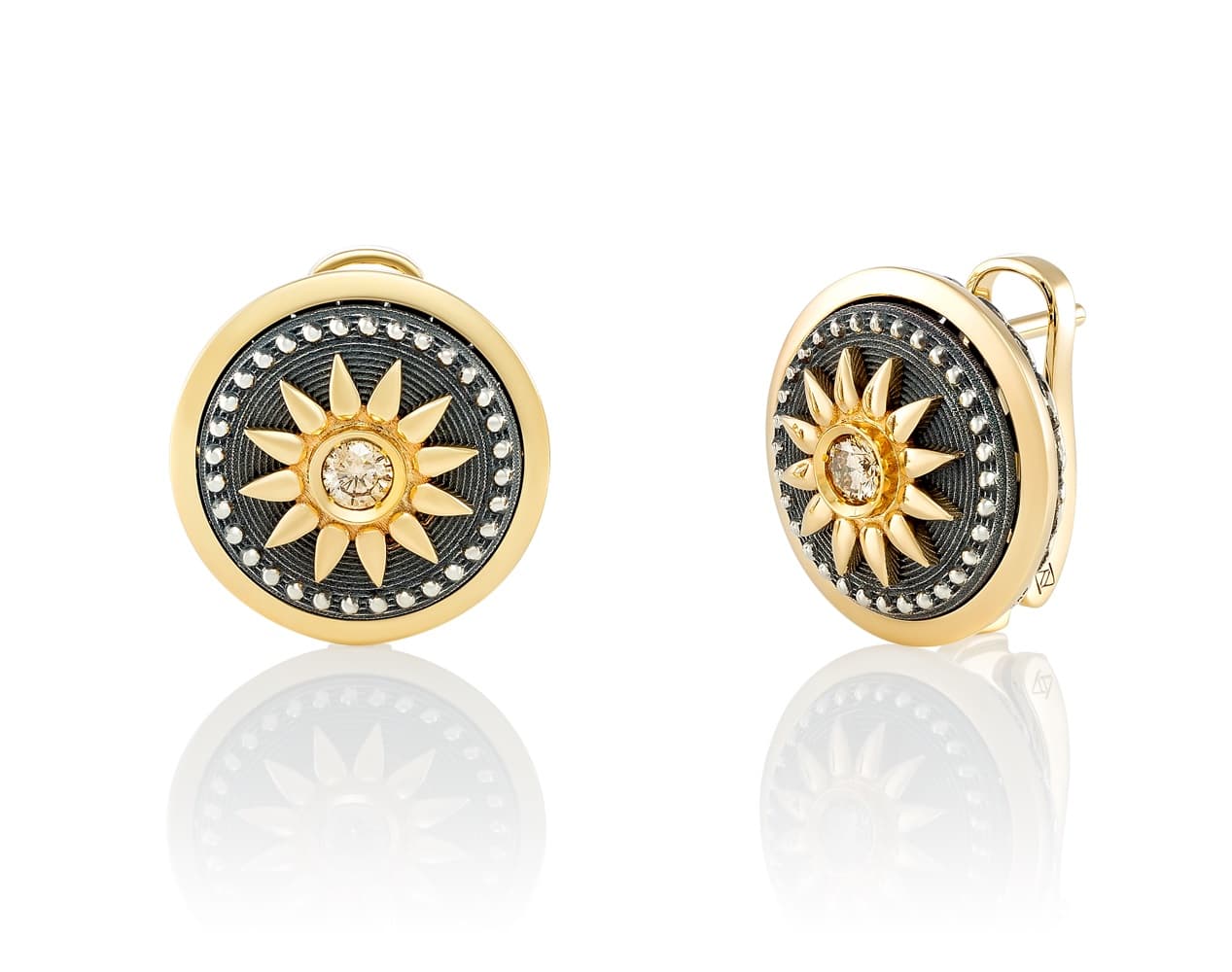 Центральный элемент — солнечный диск с 12 лучами. Он не декоративен. Он словно пульсирует внутренним светом. В его центре — редкий бриллиант Fancy Yellow, сияющий не ледяным, а тёплым светом. Этот свет не отражается — он идёт изнутри.